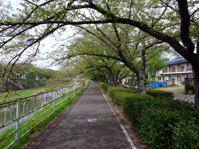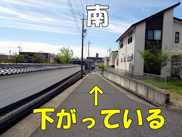 神明社隣にある月心寺横の道路から南を見ると、地形が下がっているのがよくわかります。
