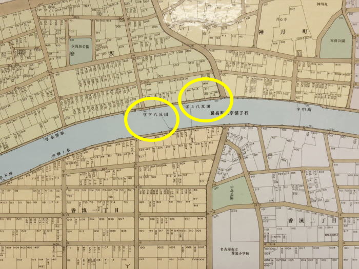 猪子石城があり横地秀種が亡くなった場所と看板にも書いてあった旧猪子石村字八反田。現在の名古屋市名東区にはそのような地名が見当たりません。そこで神社の方に尋ねると資料館に案内されました。そこには旧字名の地図があり、上八反田、下八反田の地名を見ることができました。