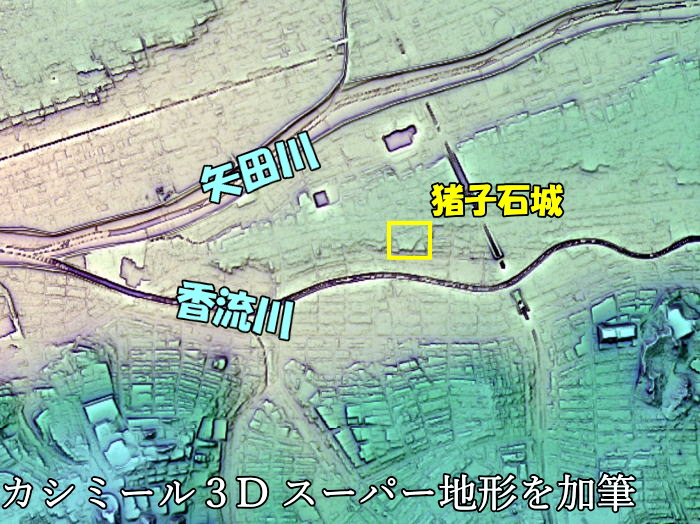 猪子石城は平城ですが、地形を見ると堅固だった事がわかります。南を香流川(かなれがわ)、北を矢田川に挟まれています。これは天然の堀にもなるので、南北が堀に守られた高台の城でした。