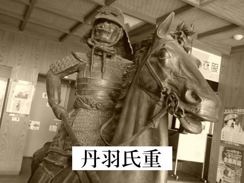 館内の銅像は戦国武将・丹羽氏重(にわ うじしげ)。天正十二年(1584)年の小牧長久手の戦いで岩崎城が攻められた時、城を守っていた武将です。当時16歳で病に臥せっていましたが、敵方の池田軍と戦い討死した武将です。