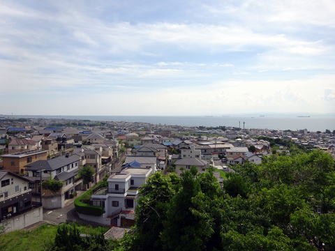 伊勢湾は西ですが北側を見ると、こんもりした森の中に大きな屋根が見えますが、あれは近くにある大草城の天守(展望台)です。