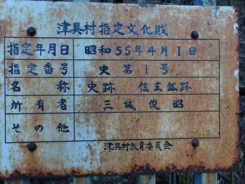 そのほか所有者などが津具村教育委員会の名のもとに書かれています。そして隣には津具金山(信玄抗)の解説が書いてありました。それを要約すると次の通りです。元亀三年(1572)頃、この地に武田信玄の勢力が伸びます。武田氏は津具川に砂金が流れている事を知り、近くに金鉱があることを察知。そしていくつかの鉱山を開発しました。これが津具金山です。