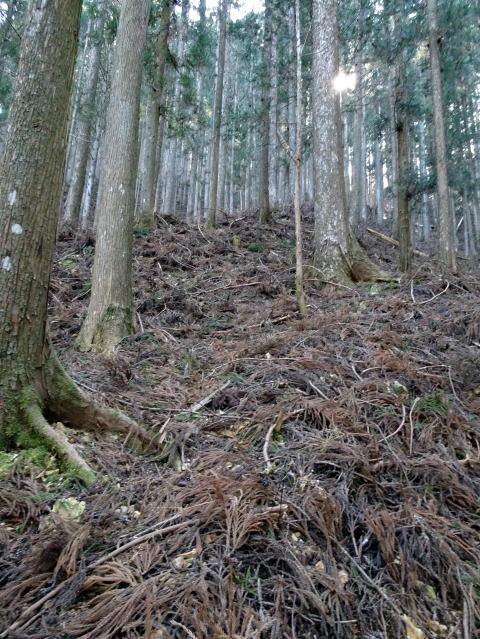 鉄柵を越えてすぐに信玄抗があるのではなく、そのまま山を左上の方へ登って行きます。よく見ると道も見えるのですが、ほとんど山を直登といった感じでしょうか。登山までとは言いませんが、正直、山城巡りみたいになるので、足元は運動靴やスニーカーなどでシッカリと固めておいた方が良いですね。