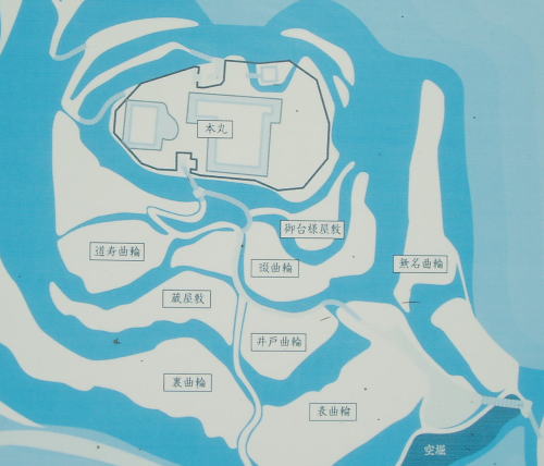 門の前は【コ】の字に折れ曲がっており、もし敵が大手門に近づくなら背後や側面から攻撃されることになります。これを虎口(こぐち)といいます。守りやすく攻めにくい工夫が施されているのがよく分かりますね。