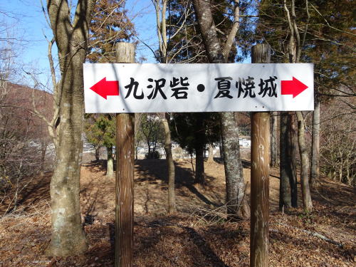 周辺の城砦の看板。これは近くにある夏焼城と久沢砦の方向を示す看板です。武節城はいくつもの街道が周辺を交差する交通の要所で、この地を押さえるために武節城以外にも周辺に城や砦が築かれました。