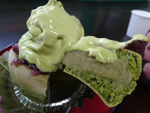 そして個人的に一番のお気に入りの冷やし大判。好きな大判焼きを選んで+250円で作ることができるので、自分が好きな味をカスタマイズできるという事ですね。今回はカテキン焼きの抹茶こしあんで作ってもらいました。200円+250円で450円のスイーツです。少し温かいカテキン焼きの上に乗った抹茶ソフトが良い感じで溶け出して、ダブル抹茶の味わいを楽しむことができます。