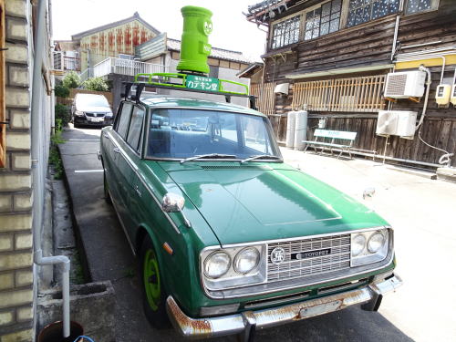 カテキン堂の駐車場は10台ほどで、隣接する中善楽器と共同の駐車場です。また駐車場には、緑のポストをルーフに乗せた、トヨタコロナがあります。
