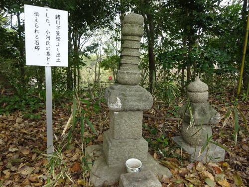 また墓所には水野氏の先祖といわれる小河氏の墓もあります。この墓石は於大公園の北側にある緒川字笠松より出土したものをこの地に移してあります。