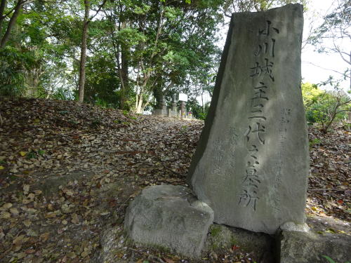 森の中を進んでいくと、小川(緒川)城主三代之墓所という石碑があります。この石碑が墓所の入り口です。