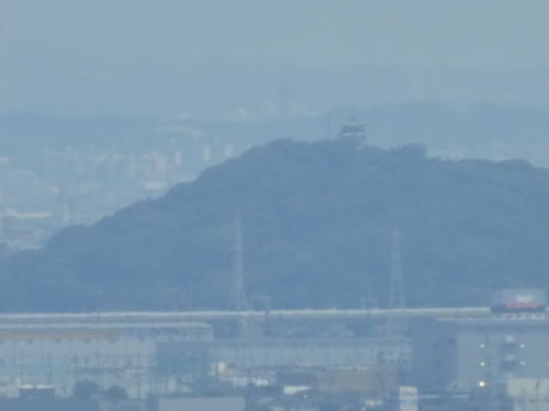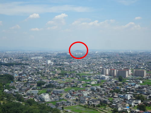 今度は東を見てみると…平野の中にポツンと島みたいに浮かんでいる山があります。一宮市から東にある独立した山。城好きの方はこのフレーズだけで何城か分かりますよね。小牧山城です(愛知県小牧市)。ここも織田信長の居城でしたが、羽柴秀吉(後の豊臣秀吉)と戦うために徳川家康・織田信雄連合軍が本陣を置いた場所でもあります。