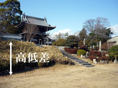 かつての本丸は、現在、大乗寺(だいじょうじ)というお寺になっています。ふもとから見てみると、若干高い場所に大乗寺がある事がわかりますよね?これが戦国時代からの地形です。