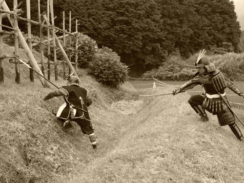 では枝に手をかけずに登れば普通に邪魔になる障害物。甲冑の草摺(くさずり)や袖(そで)に引っかかり、モタついてしまいます。これも防御の工夫なんですね。
