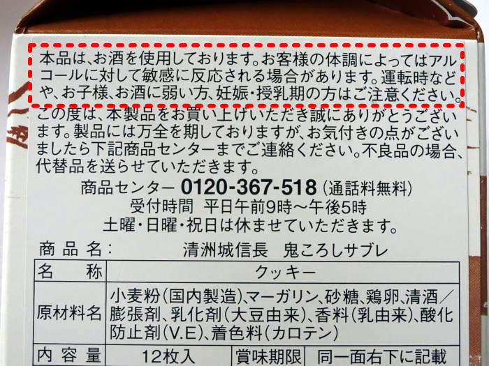 全部だとどうなるか?清洲城信長鬼殺しサブレは12枚入りです。つまり11グラム×12枚ということで総重量は132グラム。そのうち0.5%使用なので全て食べると6.6グラムの日本酒ということです。(0.55×12でも可w)