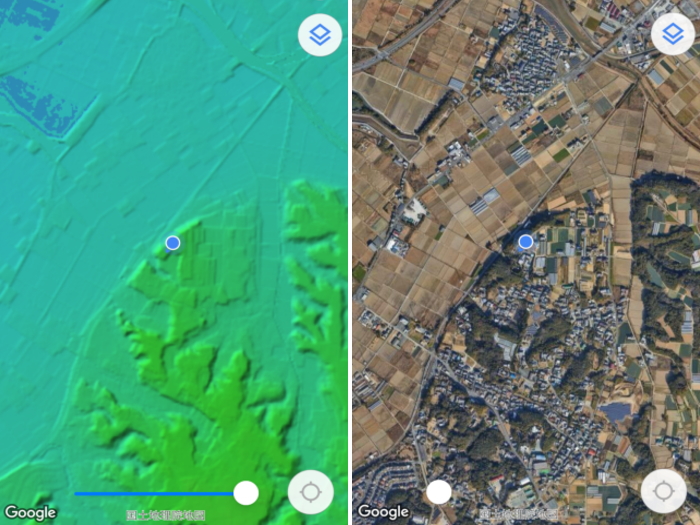 高低差を見るアプリで杉山城址の立地を見てみます。北~西に向けて低地が広がっており、その突き出た半島みたいな先端に杉山城址がありました。