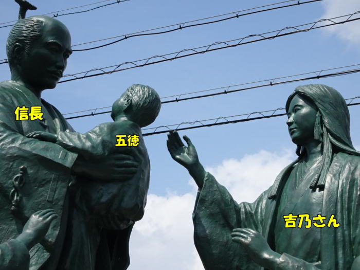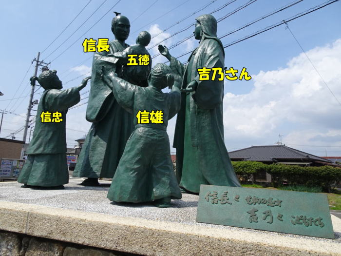 江南市布袋駅の東側(マックスバリュ江南布袋店)向かいに織田信長と側室の吉乃(きつの)、そして子どもたちの銅像が建っています。