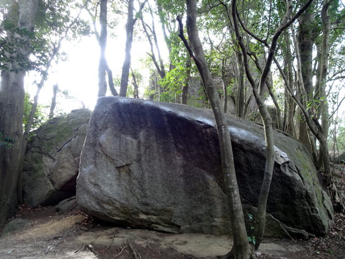 豊田市三河城山城の縄張図は愛知県中世城館跡調査報告Ⅱ西三河にありますが、ここでは表示できないのでポイントを絞って紹介します。まず目に付くのが巨石群。城山城の近くの大給城や松平城にも巨石があるので、この周辺の地形的な特徴なのでしょう。中には巨石を利用した虎口みたいな食い違いも確認できます。