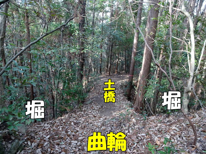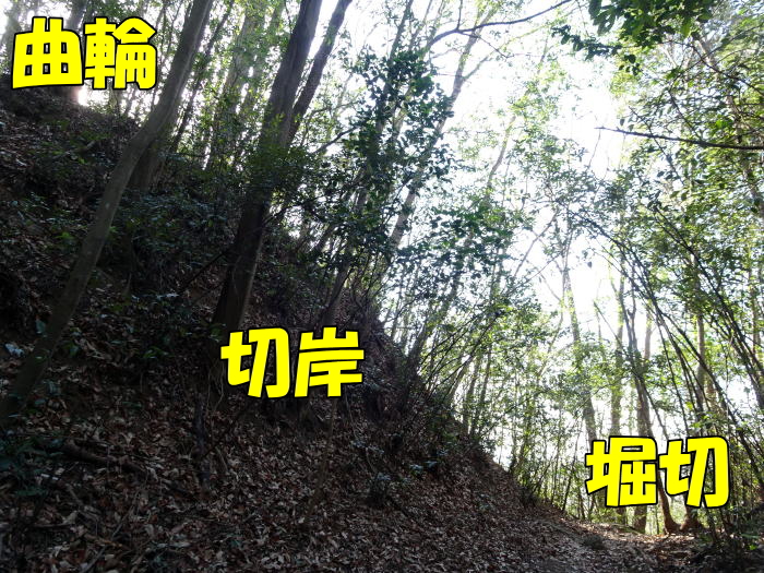 さらに四番目の堀切の背後には急峻な切岸があって、その上の曲輪から攻撃できる様子がわかります。ここまで突破してきた敵兵はヘロヘロになりながら切岸を登るか、また上から攻撃され続けながら回り込まなければなりません。