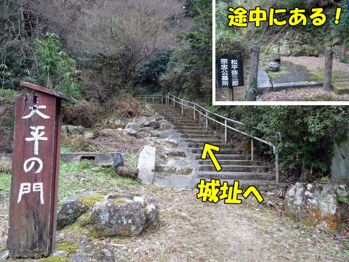 浄願寺境内の奥へ行くと古瀬間城址への登城口があります。所要時間は歩いて数分。この位置関係を見ると浄願寺は城主の館跡だったのかもしれません。途中に古瀬間城を築いたといわれる松平宗忠の墓があります。