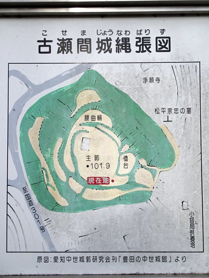 浄願寺から歩いて数分。古瀬間城址の縄張図の看板がありました。これを見ると主郭(本丸)がメインで周辺に腰曲輪(帯曲輪)を配置した縄張というのがわかります。ここで注目したいのが立地です。現在の国道301号線は、かっての挙母街道(ころもかいどう)または新城街道ともいわれ、、それを見下ろす様な場所に古瀬間城が築かれています。