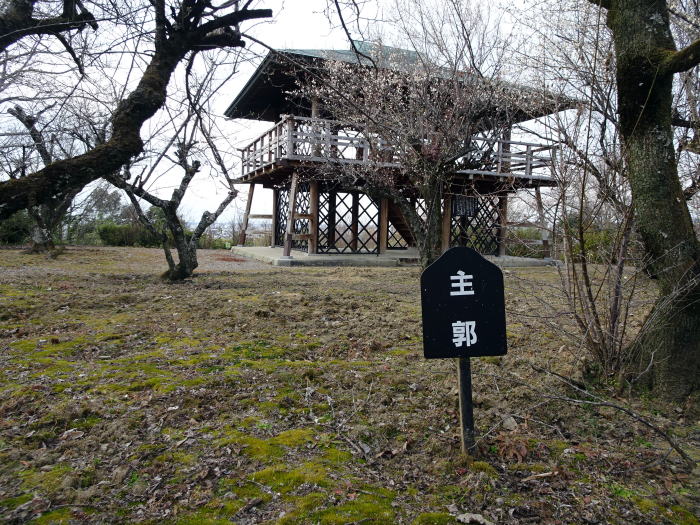 主郭(本丸)は削平地になっており梅の木が植樹されていました。訪れたのが2月中旬頃だったので梅の開花を見ることができました。後ろにあるのが展望台。登ることができます。