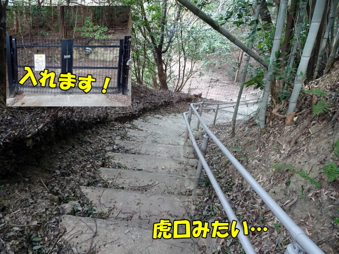 登城口を進むと門がありますが、これはイノシシ除けの門なので鍵はありません。ここを開けて中に入ります。途中で道が入り組んでおり虎口のようにも見えました。