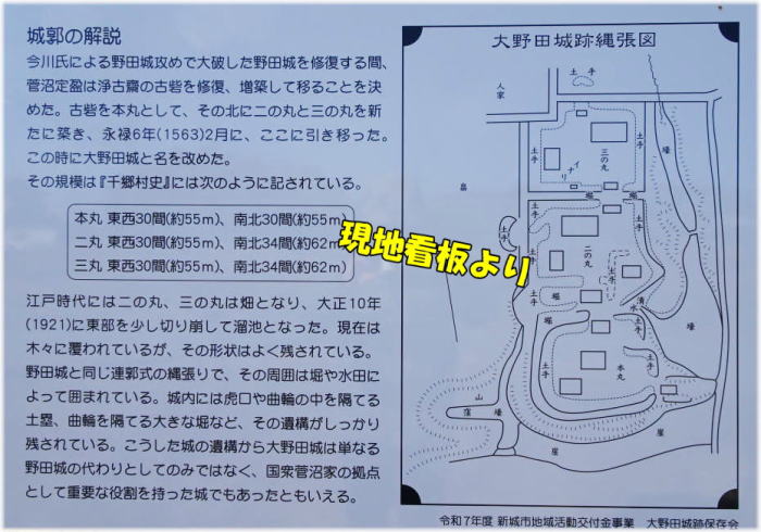 現地看板の大野田城址の簡単な歴史とかつての縄張図がありました。本丸、二の丸、三の丸を一列に並べた連郭式(れんかくしき)の縄張で、結論からいうと江戸時代~大正時代に開墾されてしまい、現在は本丸のみになってしまいました。